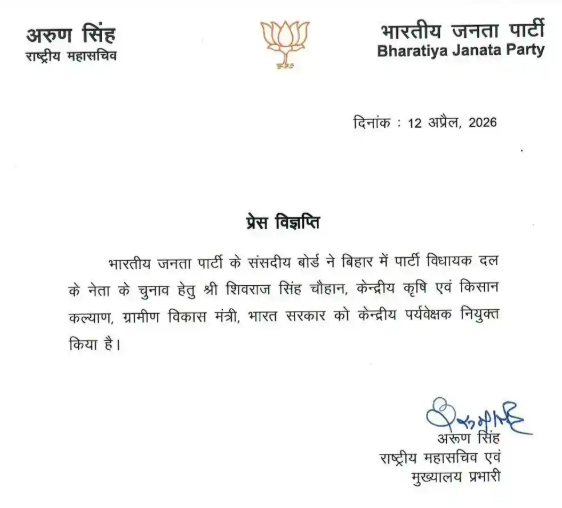 बिहार की सियासत में जारी हलचल के बीच एक बड़ी खबर सामने आई है। भारतीय जनता पार्टी ने राज्य में विधायक दल के नेता के चुनाव के लिए बड़ा फैसला लेते हुए केंद्रीय मंत्री Shivraj Singh Chouhan को केंद्रीय पर्यवेक्षक नियुक्त किया है।