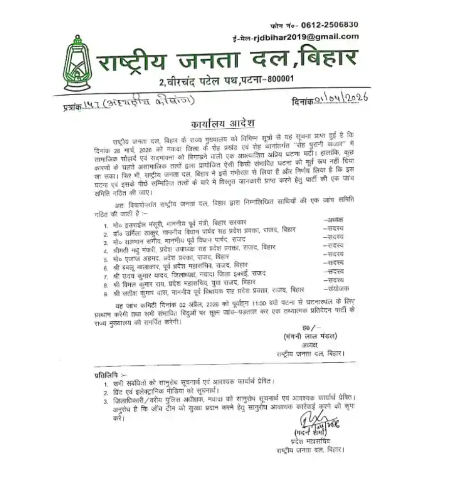 बिहार की सियासत में नवादा की एक घटना ने अचानक राजनीतिक तापमान बढ़ा दिया है। जिले के रोह प्रखंड में 28 मार्च को हुई सामाजिक सौहार्द बिगाड़ने वाली वारदात को लेकर विपक्ष ने सरकार और प्रशासन पर तीखा हमला बोला है। राष्ट्रीय जनता दल (राजद) ने इस पूरे मामले को बेहद गंभीर बताते हुए प्रशासन की कार्यशैली पर सवाल खड़े किए हैं।