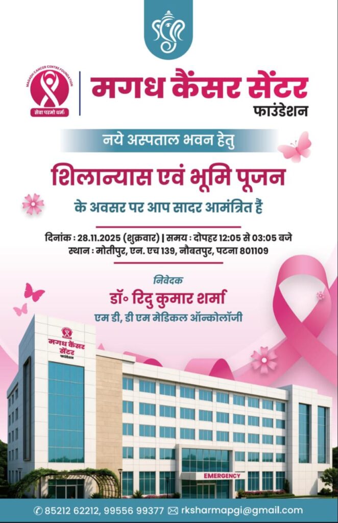 पटना: बिहार की राजधानी पटना और उसके आसपास के क्षेत्रों में स्वास्थ्य सुविधाओं को और सुदृढ़ करने के उद्देश्य से एक महत्वपूर्ण कदम उठाया जा रहा है। मगध कैंसर सेंटर फाउंडेशन द्वारा उनके नए अस्पताल भवन के निर्माण हेतु शिलान्यास एवं भूमि पूजन समारोह का आयोजन किया जा रहा है।