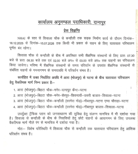 राजधानी पटना में यातायात व्यवस्था से जुड़ी बड़ी खबर है। बिहटा–खगौल मुख्य मार्ग पर कन्हौली से शिवाला चौक तक सभी प्रकार के वाहनों का आवागमन 18 दिसंबर से 15 जुलाई 2026 तक पूरी तरह से बंद रहेगा। यह निर्णय सड़क निर्माण कार्य को लेकर लिया गया है। इस संबंध में दानापुर के अनुमंडल पदाधिकारी (SDO) ने आधिकारिक आदेश जारी कर दिया है।